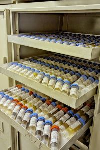 Головним джерелом надходження альгологічного матеріалу є експедиційні збори співробітників і аспірантів Інституту, які плідно Станом на 2025 р. фонди Альготеки налічують 32 655 фіксованих проб. В Альготеці зберігаються альгологічні проби фітопланктону, бентосу та обростань різноманітних субстратів. Крім водних проб в альготеці представлені колекції проб з аерофітних місцезростань та збори ґрунтових проб. Основу фондового матеріалу Альготеки KW-A, на відміну від інших гербарних колекцій водоростей, складають альгологічні проби, які фіксовані у 4-% розчині формаліну і зберігаються у скляних або пластикових віалах. Це дозволяє забезпечити тривале зберігання альгологічних зразків, придатних для Крім того, у фондах KW-A зберігаються альгологічні зразки з типових локалітетів видів водоростей, вперше описаних з території України. Окрему цінність представляють типові зразки водоростей, наприклад, – голотипи таксонів, вперше описаних для науки. В різний час до альготеки передані фрагментальні альгологічні матеріали, зібрані співробітниками Інституту ботаніки з різних районів України: збори Д.К. Зерова, А.М. Окснера, В.І. Комендара (із Закарпаття), Є.М. Кондратюка (з Житомирської області); М.І. Котова, Є.Д. Карнаух, А.І. Барбарича (з Чорноморського Узбережжя Криму). У фондах альготекии знаходяться також проби зібрані співробітниками відділу за межами Україні – з Азербайджану, Монголії, Ізраїлю, Білорусії, Італії, Угорщини, Грузії, Латвії, Туреччини, Молдови та інших країн. За останні 10 років фонди Альготеки поповнилися зборами зразків з водойм Монголії (М.С. Куліковський), Білорусі (О.В. Коваленко), Ізраїлю (О.М. Виноградова, П.М. Царенко, В.В. Ступіна), Італії (С.С. Садогурська, О.М. Кривошея), Угорщини (В.Ю. Березовська) та багатьох регіонів України. Альготека також містить колекцію гербарних зразків макроскопічних водоростей (прісноводних нитчастих, харових, а також морських водоростей). Гербарій репрезентує флору водоростей-макрофітів Середземного, Північного моря та Чорного морів, деяких чорноморських лиманів та прісних водойм Київської височинної області. У фонді гербарію макрофітів також знаходяться раритетні зразки, наприклад, гербарні колекції Л. Рейнхарда, колекція ексикатів Л. Раберхорста, гербарні збори Н.О. Мошкової, зокрема – рідкісних червоних водоростей з Криму та ін. (60-ти рр. ХХ ст.). Співробітники інших установ можуть отримати дозвіл на работу з альготечними матеріалом у кураторки Альготеки (д-р філ. С.С. Садогурська), для чого мають надати офіційний лист-звернення на адресу Дирекції Інституту ботаніки.