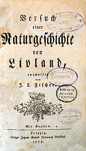 Fischer, Jacob Benjamin. Versuch einer Naturgeschichte von Livland; mit Kupfern. — Leipzig: Verlegts Johann Gotlob Immanuel Breitkopf, 1778. — [24], 374, [16] S., 1 Taf. Ill. Бібліогр.: CGBN, 52, col. 83