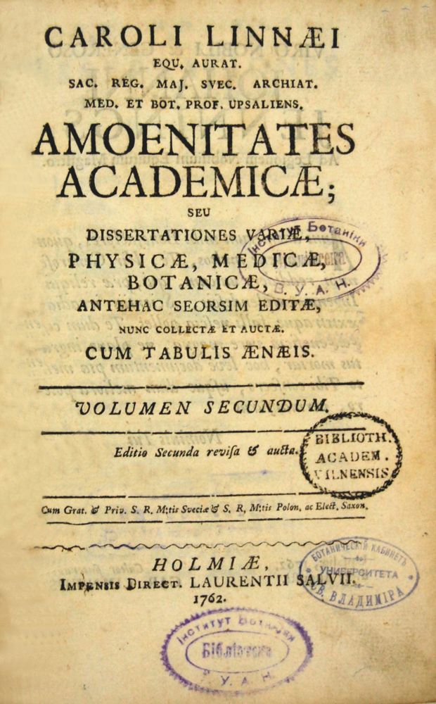 Linné, Carl. Amoenitates academicae botanicae antehac seorsim editae nunc colectae et auctae cum tabulis aeneis; accedit Hypothesis nova de febrium intermittentium causa. — Vol. I–VII. — Lugduni Batavorum [Leiden]: Apud Cornelium Haak; Holmiae [Stockholm]: Impensis direct. Laurentii Salvii, 1749–1769.
