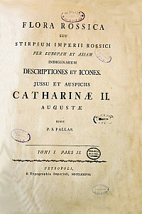 Pallas, Petrus Simonus. Flora Rossica seu stirpium imperii rossici per europam et asiam indigenarum descriptiones et icones; jussu et auspiciis Catharinae II Augustae. — T. I., P. I–II. — Petropoli [Санкт-Петербург]: